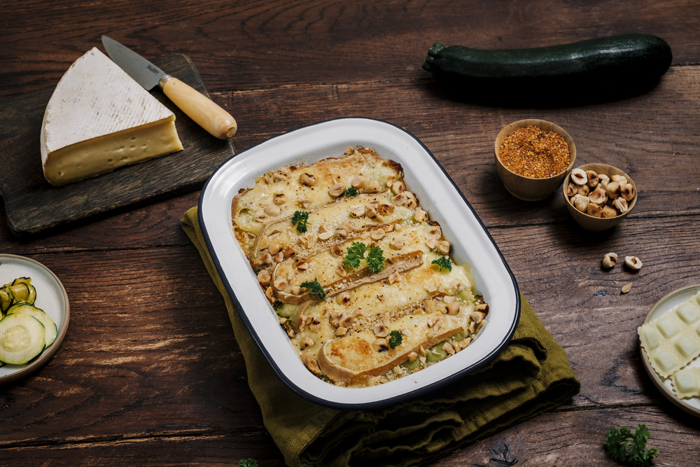 Gratin de ravioles de Romans, courgettes & Saint-Nectaire