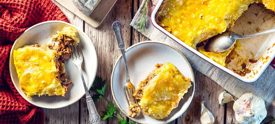 Parmentier de courge, effiloché d’agneau, pain à l’ail, gratiné au Saint-Nectaire