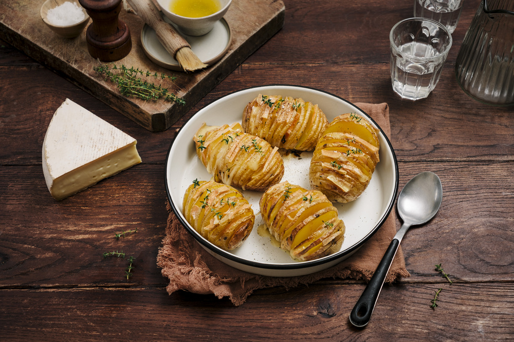 Laver et sécher les pommes de terre. Les inciser en fines tranches sans aller jusqu’au bout (utiliser deux baguettes en guide pour ne pas les couper complètement).