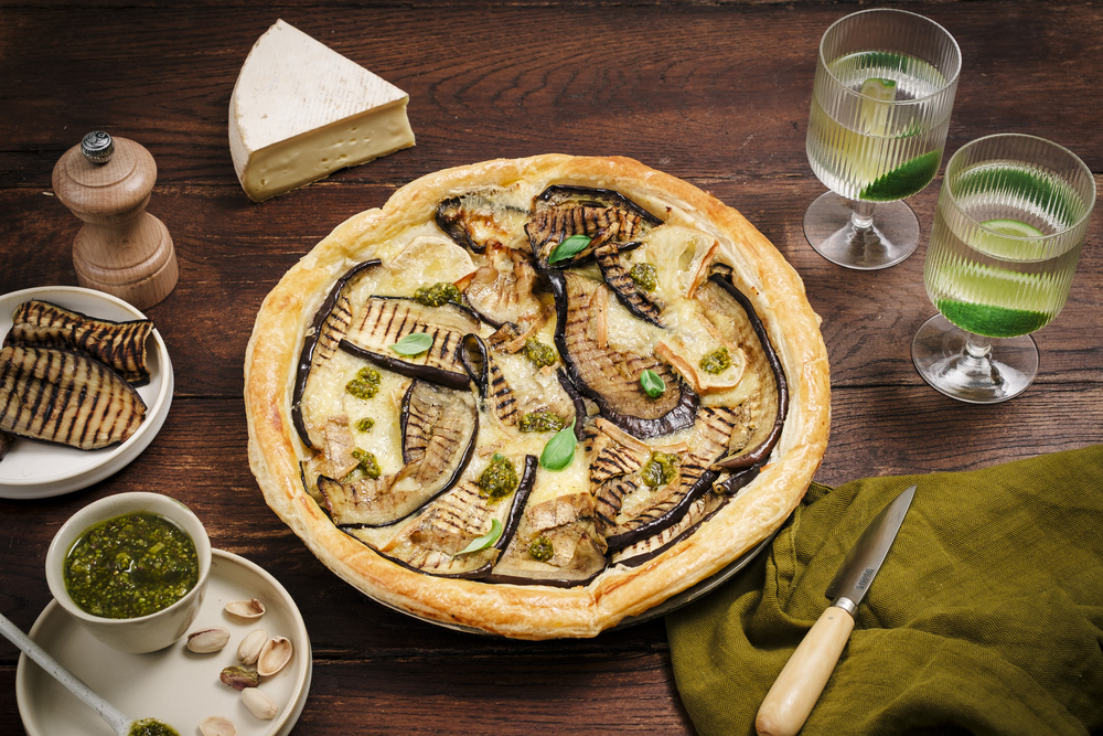 Tarte fine aubergine, Saint-Nectaire, pistache & citron confit
