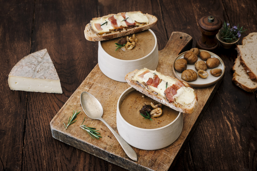 Velouté de châtaignes, tartine de Saint-Nectaire & lard de campagne